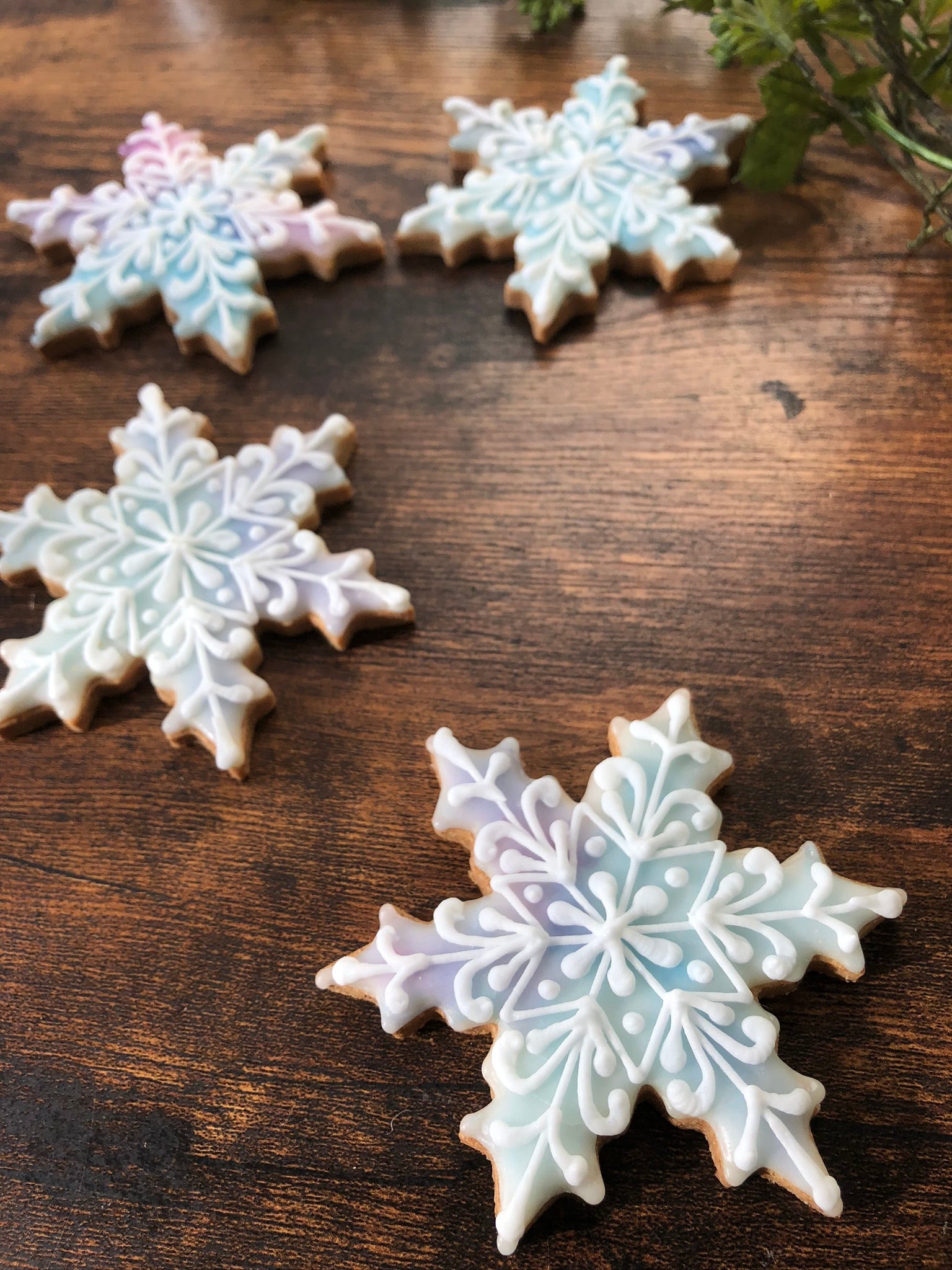 立体感のある繊細なデザインで彩られた、雪の結晶デザインのクリスマスアイシングクッキー。